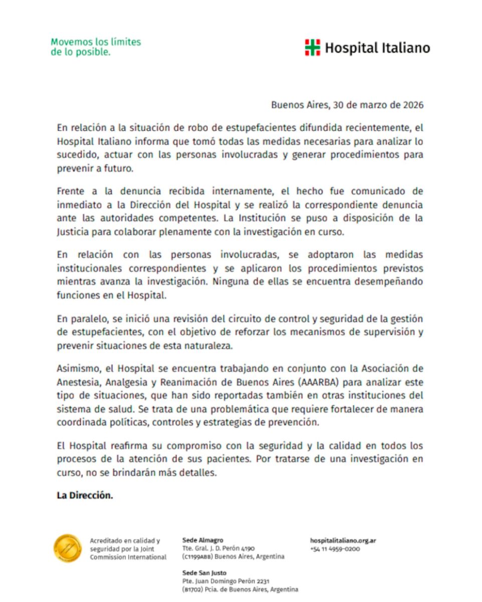 El propio comunicado del Hospital Italiano reconoció el “robo de estupefacientes” en el área de anestesiología y detalló que se tomaron medidas inmediatas, tanto administrativas como judiciales. Ninguna de las personas involucradas continúa desempeñando funciones en la institución. A la par, se reforzaron los controles internos sobre la gestión de medicamentos y se trabaja en conjunto con la Asociación de Anestesia, Analgesia y Reanimación de Buenos Aires (AAARBA) para analizar y prevenir casos similares en otros centros de salud.