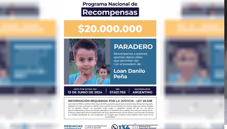 El Gobierno Nacional, a través del Ministerio de Seguridad Nacional, confirmó que se aumentaron las recompensas por las desapariciones de los pequeños Loan Peña y Lian Flores. El primero fue visto por última vez a mediados de junio de 2024 en Corrientes y el otro chico desde fines de febrero de 2025 en Córdoba.