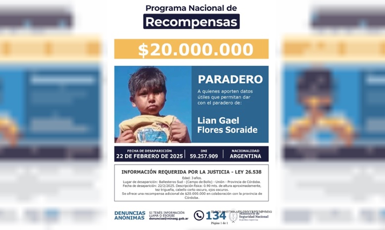 En esta ocasión, el Gobierno Nacional y el Ministerio impusieron al comienzo de la pesquisa una recompensa de $10 millones para quién aporte datos fehacientes de Lian, quién desapareció el 22 de febrero de 2025, en Ballesteros Sud, provincia de Córdoba, al momento de la siesta.__IP__