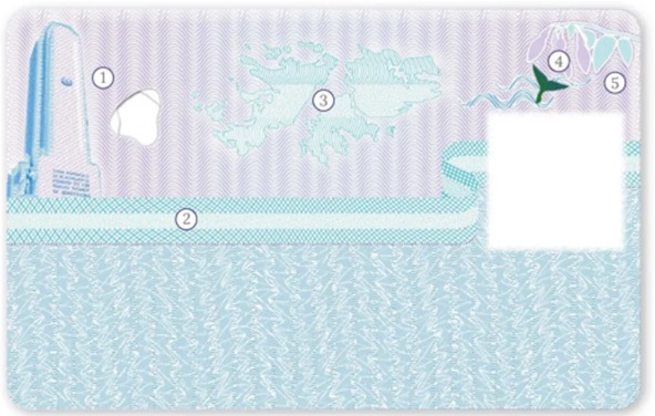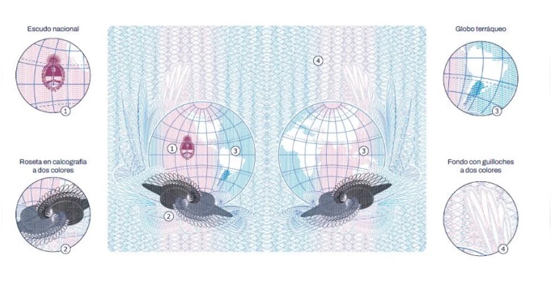 El fondo de la página tiene guilloches perdidos y espejados, impresos a DOS (2) colores, una representación estilizada del globo terráqueo con tramas que diferencian la silueta de la República Argentina, el símbolo internacional de documentos de viaje, una imagen MIRAGE y una ventana transparente.