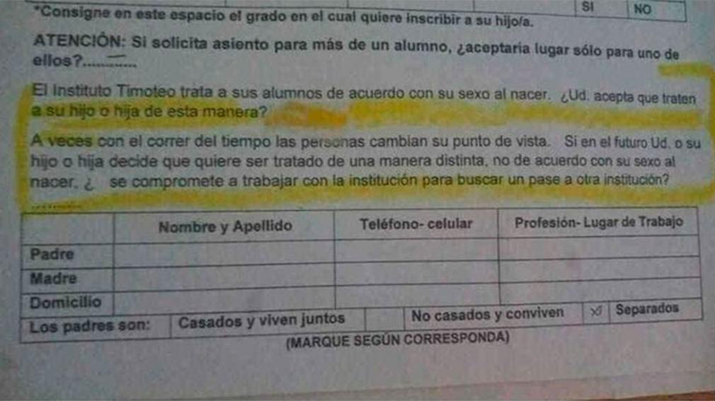 En la provincia de Salta el Instituto Timoteo trata a sus alumnos de acuerdo con su sexo al nacer. ¿Usted acepta que traten a su hijo o hija de esta manera? Si en el futuro usted o su hijo o hija decide que quiere ser tratado de una manera distinta, no de acuerdo con su sexo al nacer, ¿se compromete a trabajar con la institución para buscar un pase?", plantea la solicitud de consideración de nuevos alumnos para 2022 del colegio cristiano evangélico ubicado en el barrio 2 de Abril, en Cerrillos.