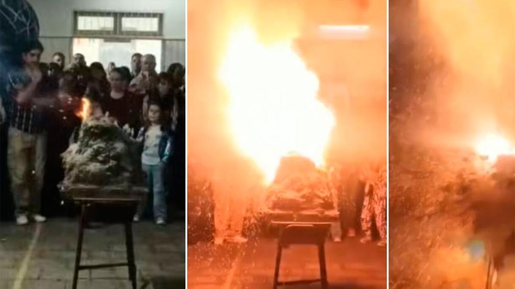 Luego prosiguió a detallar: “Esta combinación va a formar la pólvora que lo que va a hacer es lo que va a explotar. Para hacer esto estuvimos, como unas cuatro semanas para esperar que se seque el barro, pisar bien todo el telgopor para que quede la forma, tener mucho cuidado con lo que vamos a mezclar y, luego de todo eso, tenemos ese volcán", detalló la alumna a lo que una profesora del colegio anticipó: “Lo hacemos erupcionar”, dijo y felicitó con aplausos la explicación de la alumna que encendió el experimento antes del inesperado desenlace.Las imágenes muestran el momento exacto en que el experimento detona de manera violenta. Una madre que presenció el hecho relató al diario La Opinión: “Fue un estruendo tremendo, todos empezaron a gritar, había chicos con la cara ensangrentada y padres que no sabían qué hacer”.