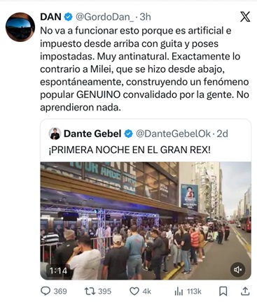 “No va a funcionar esto porque es artificial e impuesto desde arriba con guita y poses impostadas. Muy antinatural. Exactamente lo contrario a Milei, que se hizo desde abajo, espontáneamente, construyendo un fenómeno popular genuino convalidado por la gente. No aprendieron nada”, expresó Dan desde su cuenta de X.