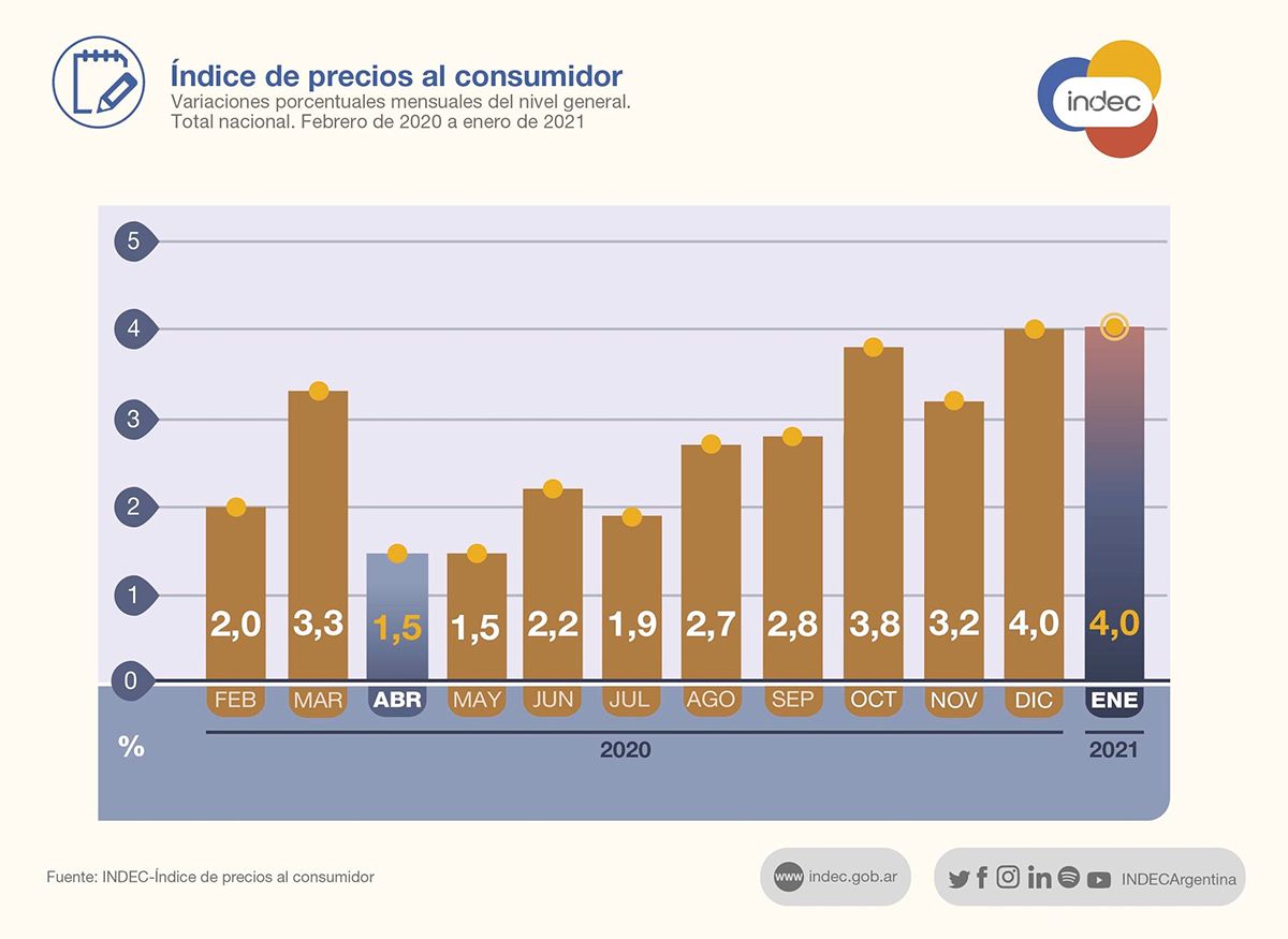 De esta manera, el Índice de Precios al Consumidor (IPC) alcanzó 4% mensual en enero, igual cifra que la registrada en diciembre, y presentó una inflación interanual de 38,5%