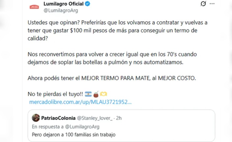 Todo comenzó cuando, desde su cuenta oficial, recomendaron comprar termos de la marca Stanley. A partir de allí, la cuenta de Lumilagro —que es manejada por su propio dueño— publicó un mensaje que generó una ola de críticas.