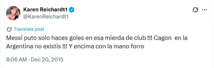 “Messi puto solo haces goles en esa mierda de club !!! Cagon en la Argentina no existis !!! Y encima con la mano forro”, fue la publicación de Reichardt en diciembre de 2015, cuando Messi convirtió en un encuentro con el Barcelona.