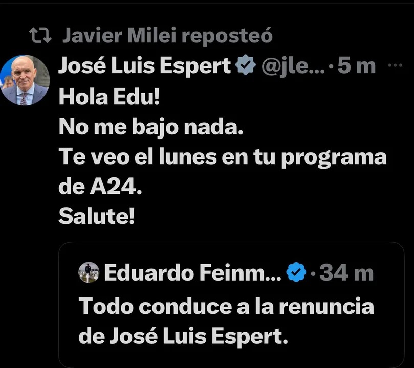 “Hola Edu! No me bajo nada. Te veo el lunes en tu programa de A24. Salute!”, publicó Espert a las 22.14, en respuesta al mensaje que el periodista había difundido apenas 27 minutos antes. En su posteo, Feinmann había afirmado: “Todo conduce a la renuncia de José Luis Espert”.