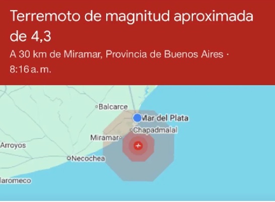 Según los primeros datos difundidos por Google y reportes de actividad sísmica, el movimiento ocurrió a las 8:16 y habría tenido una magnitud aproximada de 4,3. El epicentro se ubicó a unos 30 kilómetros de Miramar, en una zona comprendida entre esa localidad y Chapadmalal, sobre el nivel del mar.