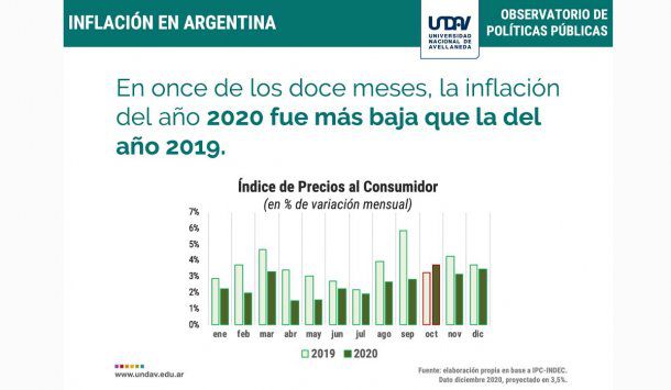 Al comparar la dinámica de la inflación mensual entre 2020 y 2019, solo un mes del 2020 (octubre) superó al mismo mes del 2019 (3,8% vs 3,3%), mientras que, en el resto de los meses, 2019 presentó tasas mensuales más altas. Se prevé lo mismo para diciembre.