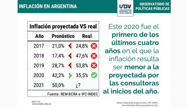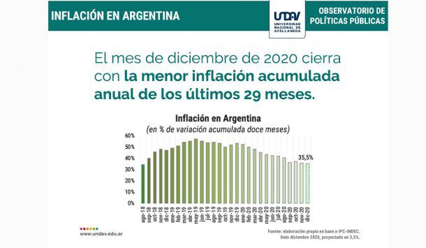 Un informe del Observatorio de Políticas Públicas de la Universidad Nacional de Avellaneda (UNDAV) reveló que en 2020 se logró una reducción de aproximadamente 18,4 puntos porcentuales en materia de inflación en relación a 2019. La tasa de inflación interanual cerrará en torno al 35,5%, suponiendo 3,5% de inflación intermensual en diciembre.