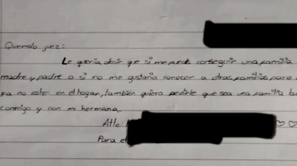 “Le quería decir si me puede conseguir una familia con madre y padre y, si no, me gustaría conocer otras familias para que ya no esté en el hogar”, escribió. Y remarcó su pedido central: “Una familia que sea buena conmigo y con mi hermana”, subrayando la importancia de seguir juntas.