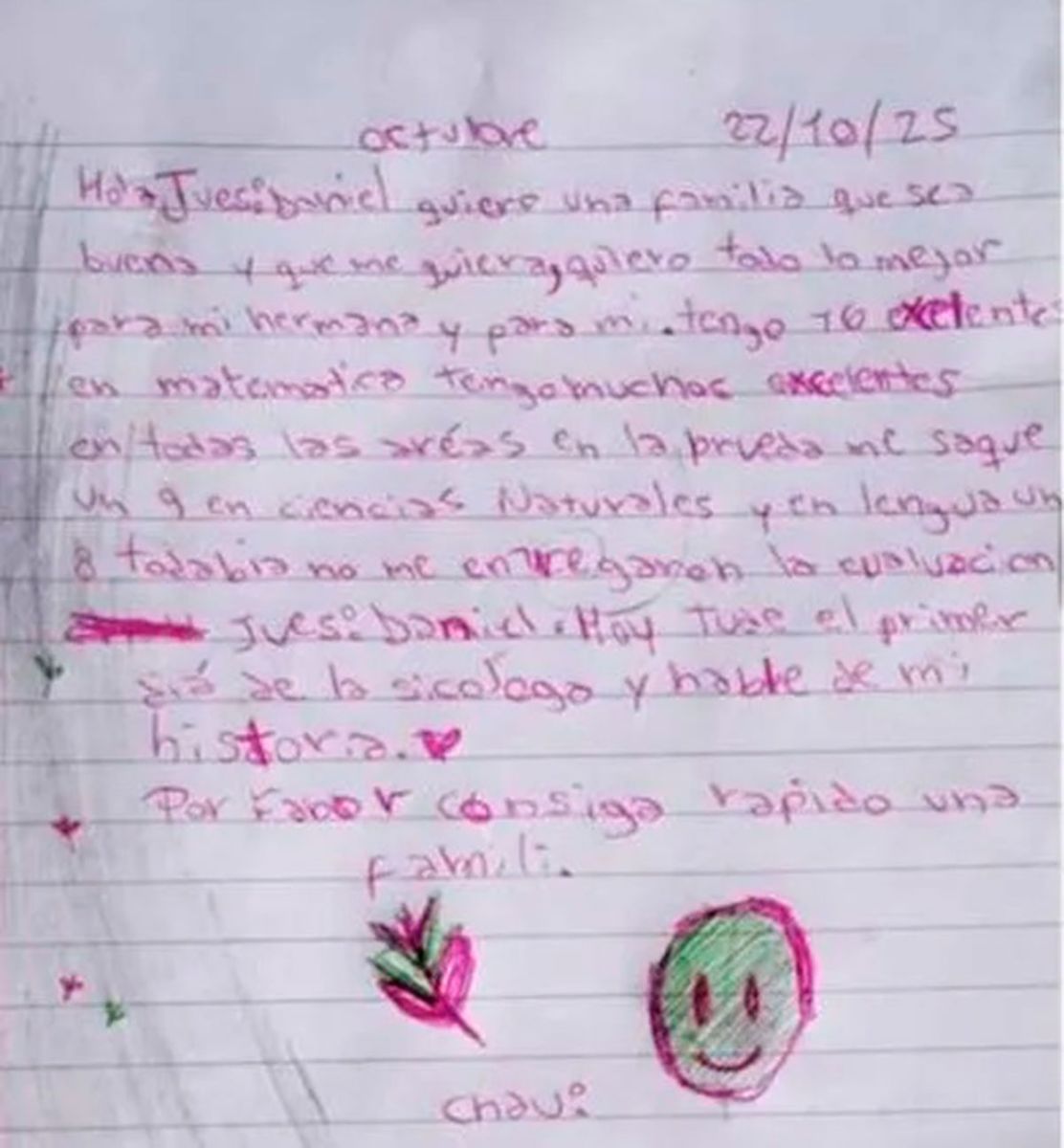 El final de su carta concentra la urgencia de una infancia que transcurre entre paredes ajenas. Sin rodeos, escribió: “Por favor, consiga rápido una familia”. Cerró con un simple “chau” y el dibujo de una carita feliz, como símbolo de una esperanza que todavía se sostiene.