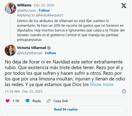 A lo que Villarruel respondió: “No deja de llorar ni en Navidad este señor extrañamente rubio. Que existencia más triste debe tener. Rezo por él y por todos los que sufren y hacen sufrir a otros”.