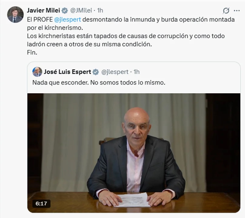 "El PROFE @jlespert desmontando la inmunda y burda operación montada por el kirchnerismo", comienza el tuit del Presidente.
