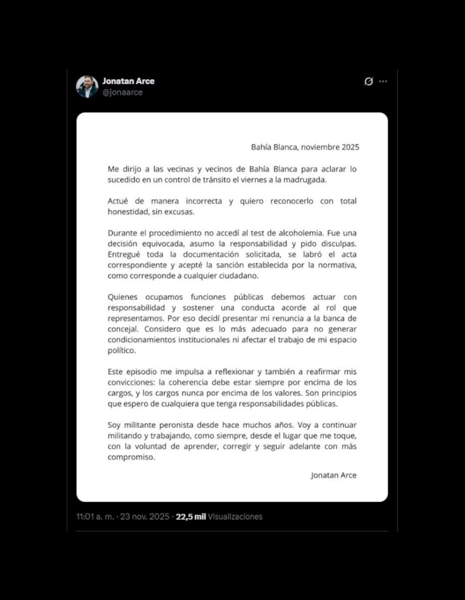 El concejal de Bahía Blanca Jonatan Arce renunció este domingo a su banca legislativa luego de que se conociera que se había negado a realizar el test de alcoholemia durante un operativo vehicular en esa ciudad bonaerense.