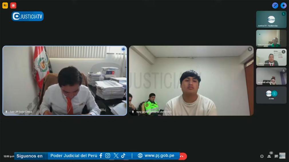 De remera blanca, con dos policías escoltándolo y en compañía de un defensor oficial, “Pequeño J” participó mediante una plataforma virtual de una sesión en el Juzgado de Investigación Preparatoria de Chilca, en Lima.
