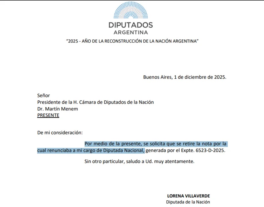 La diputada nacional de La Libertad Avanza (LLA) Lorena Villaverde, quien no pudo jurar el viernes pasado como senadora por impugnaciones a su pliego a raíz de consideraciones éticas vinculadas a causas judiciales por narcotráfico, retiró este martes la renuncia que había formalizado a su actual banca, lo que abre la posibilidad de que continúe en su actual cargo en la Cámara baja hasta concluir el mandato en 2027.