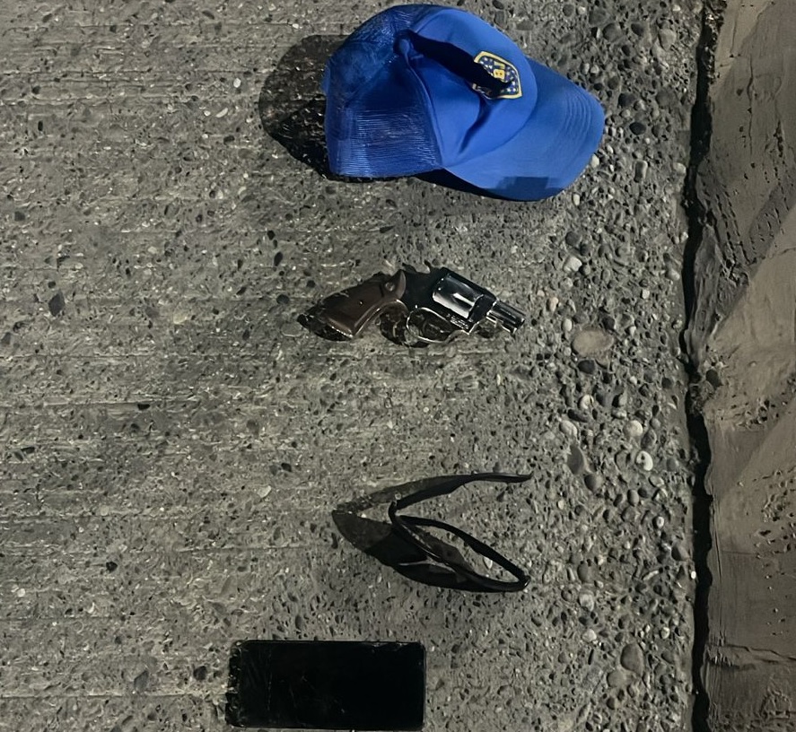 Durante la intervención, los uniformados observaron la caída de un elemento metálico desde las prendas del sujeto, constatando posteriormente que se trataba de un arma de fuego tipo revólver.