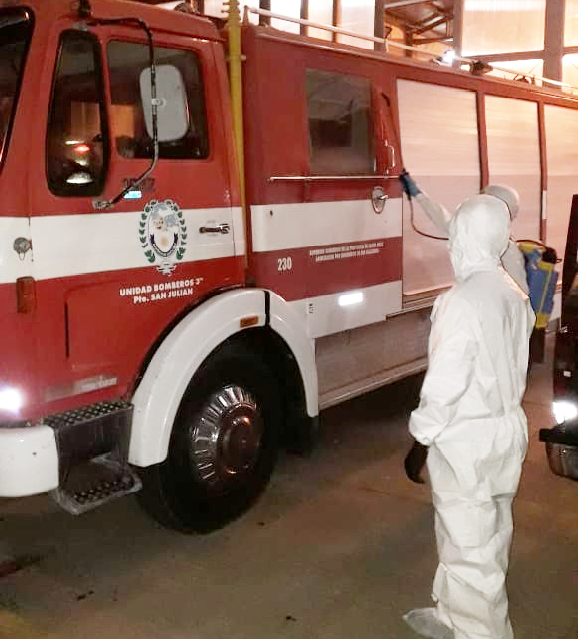 En la jornada de hoy, una comisión a cargo de los Comisarios Juan Carlos Contreras y Diego Ezequiel Böthin, se dirigió hasta la localidad de Puerto San Julián para realizar la desinfección de los móviles de la institución, de la Prefectura Naval Argentina, dos móviles del parque automotor de la Municipalidad del lugar, y de las dependencias policiales que poseen mayor fluidez de personas a diario, a consecuencia del Operativo COVID-19.