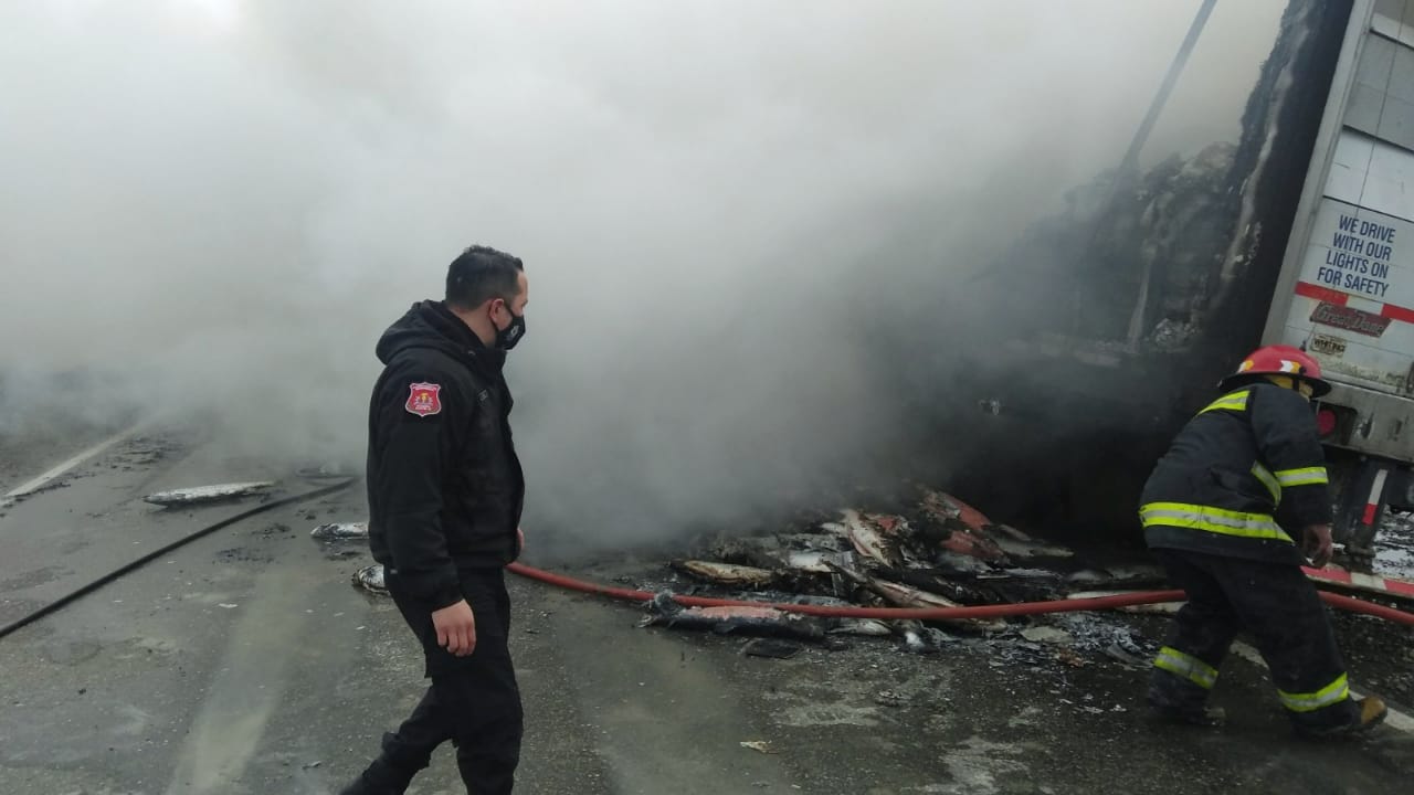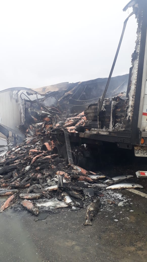 De acuerdo a la información que tuvo acceso nuestro portal al llegar los bomberos se visualizaba que el camión estaba sobre la banquina siendo tomado por el fuego un amplio sector del camión. La parte del techo y uno de los laterales estaban totalmente destruidos y en su interior la carga de salmónidos que se encontraba estibados en cajas de cartón, también fueron presa del incendio.