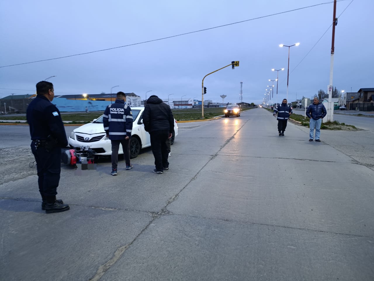 El hecho ocurrió cerca de las 19:05, cuando una motocicleta marca Siam 110, color roja, en la que viajaban dos personas adultas, colisionó con un automóvil Toyota Corolla blanco. Tras el impacto, los ocupantes del motovehículo resultaron lesionados y debieron ser asistidos por personal sanitario del Hospital Regional Río Gallegos.