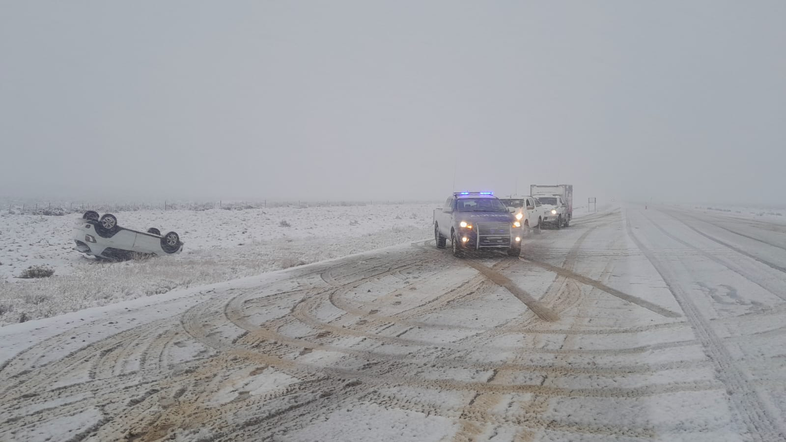 Un vuelco se registró en las últimas horas en la zona de El Cerrito, cuando las condiciones climáticas eran adversas, situándo el incidente a unos 10 kilómetros en dirección a El Calafate. No se reportaron personas lesionadas.