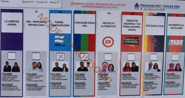 Estas on La Libertad Avanza (Jairo Guzmán–Perla dela Fuente); PRO-Propuesta Republicana (Leonardo Roquel–Andrea Galllegos); Fuerza Patria (Juan Carlos Molina–Moira Lanesán Sancho); Coalición Cìvica ARI (Pedro Muñoz–María Olmos); Proyecto Alternativo (Jorge Cruz-Johana Busto); Frente de la Izquierda y de los Trabajadores (Gabriela Ance–Luis Díaz); Por Santa Cruz (José Daniel Álvarez–Gisella Martínez); Movimiento al Socialismo (Jorge Mariano–María Gaspari).