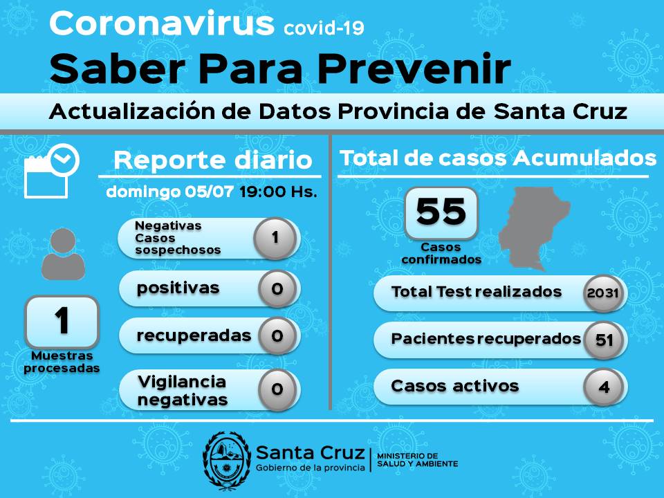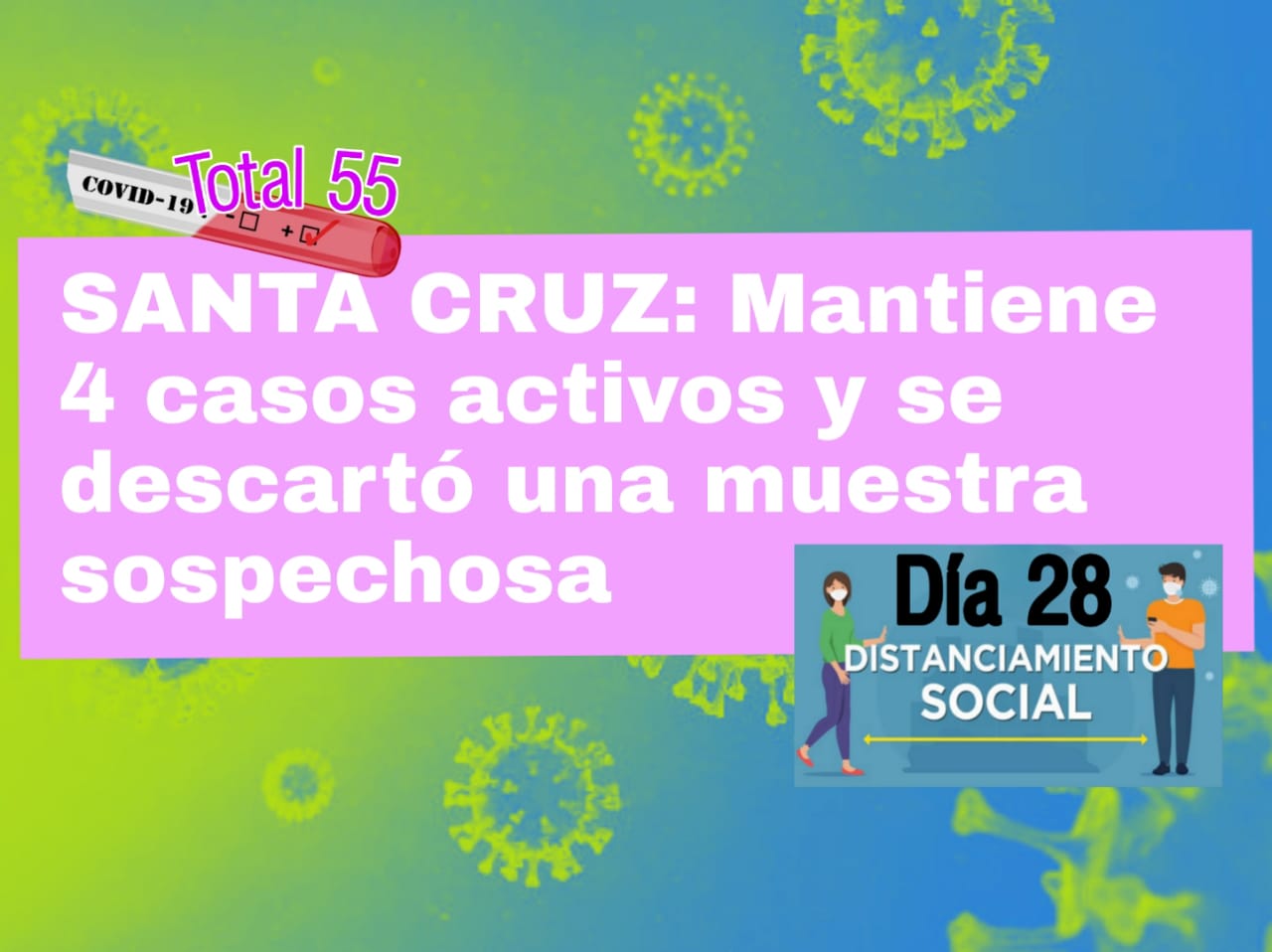 En el día 27 de Distanciamiento Social, el reporte de las 19:00 horas del Ministerio de Salud y Ambiente indicó que se mantiene un total de 55 casos positivos a coronavirus, de los cuales 51 negativizaron al virus. Hasta el momento, el número de casos descartados es de 1976 en todo el territorio santacruceño.