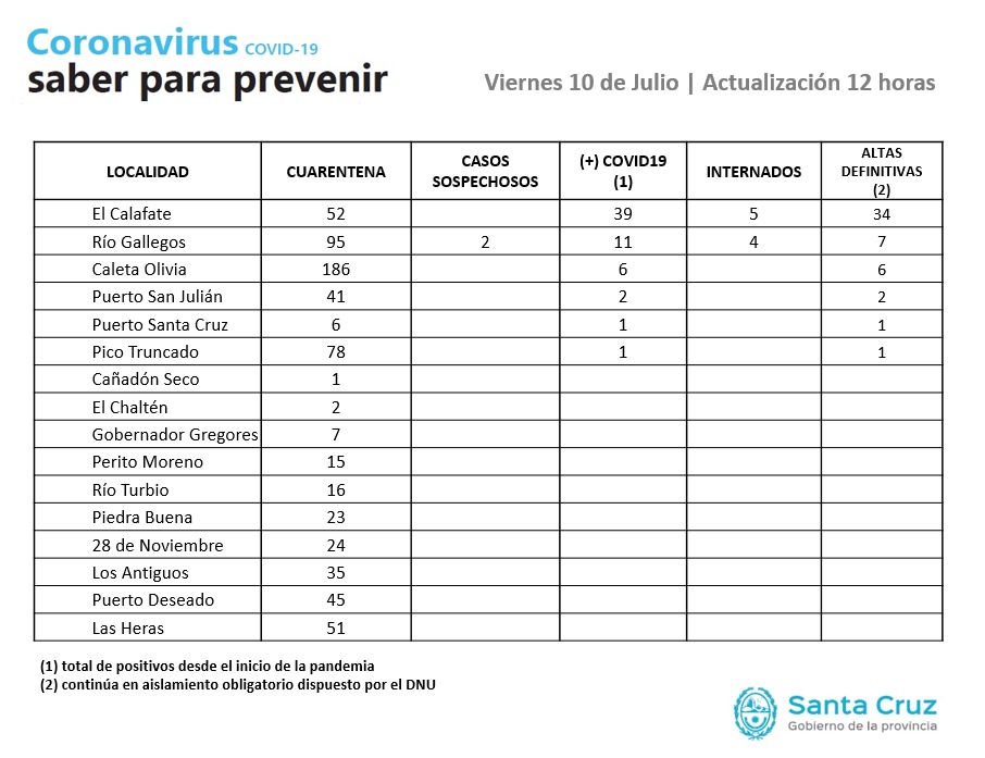 Así lo indican desde el Ministerio de Salud y Ambiente en el reporte del mediodía. Vale indicar que actualmente Santa Cruz tiene 677 personas en cuarentena, donde la localidad con mayor porcentaje es Caleta Olivia con 186, seguida por Río Gallegos con 95 y El Calafate con 52.