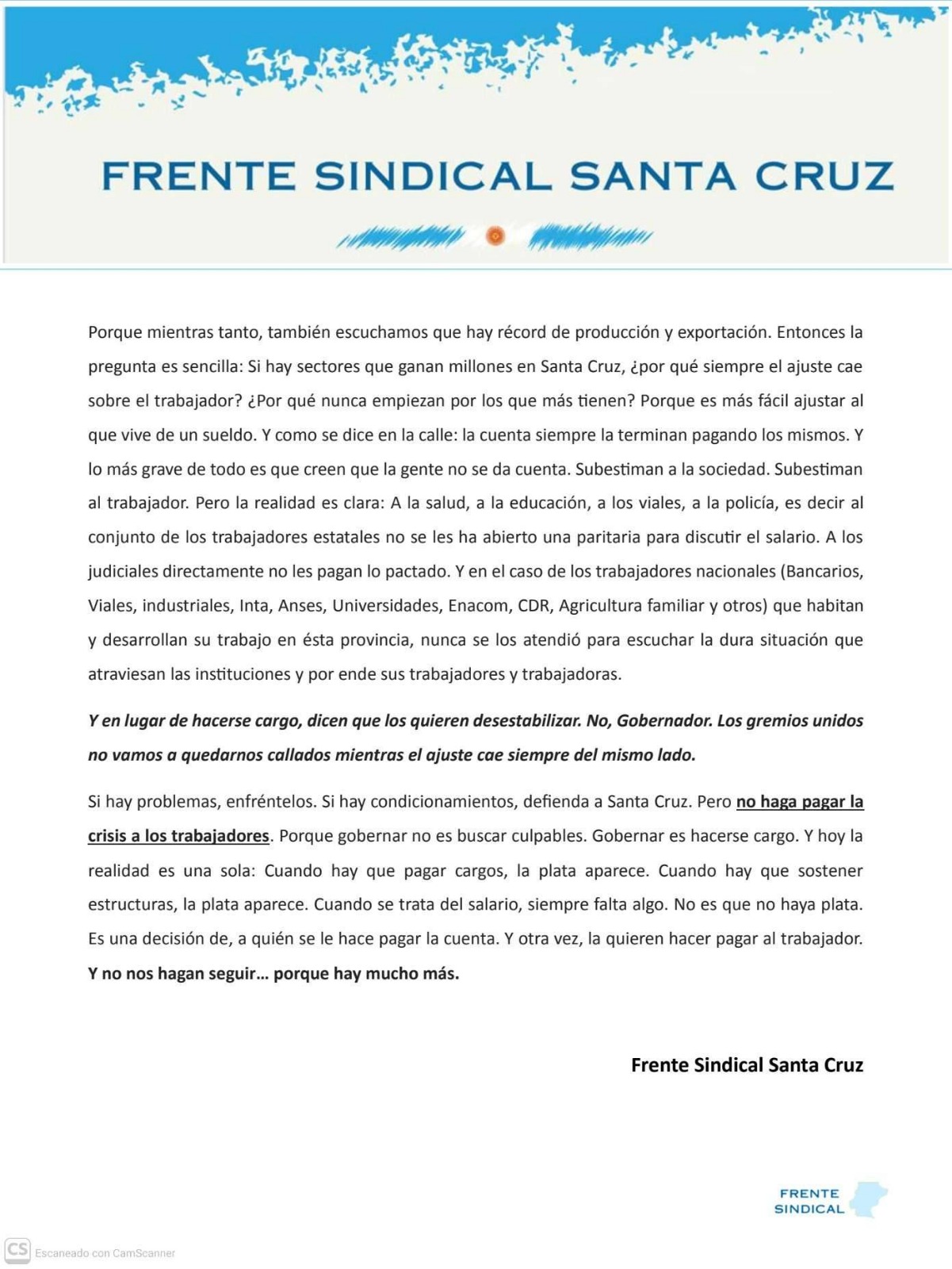 En el documento, los gremios cuestionaron la falta de apertura de paritarias y denunciaron un ajuste que, según señalaron, recae principalmente sobre los trabajadores. “Si hay sectores que ganan millones en Santa Cruz, ¿por qué siempre el ajuste cae sobre el trabajador?”, plantearon.