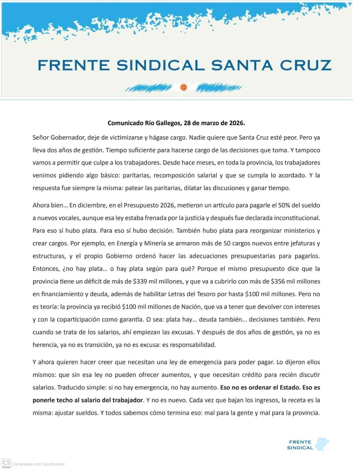 El Frente Sindical Santa Cruz difundió un comunicado este 28 de marzo en el que expresó duras críticas hacia el Gobierno provincial, en el marco de la situación salarial y laboral que atraviesan distintos sectores de trabajadores.