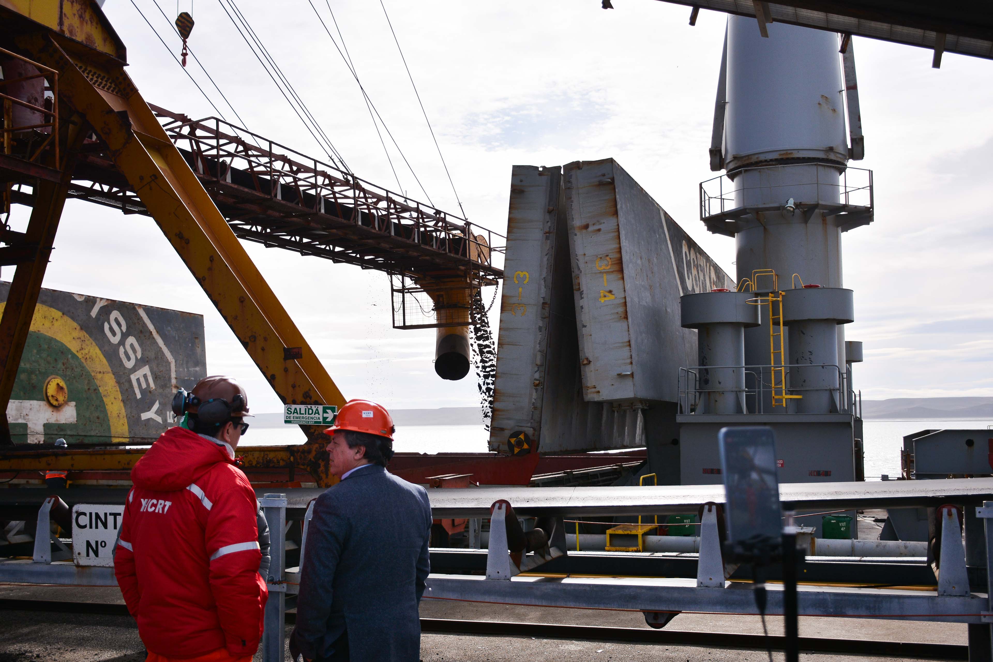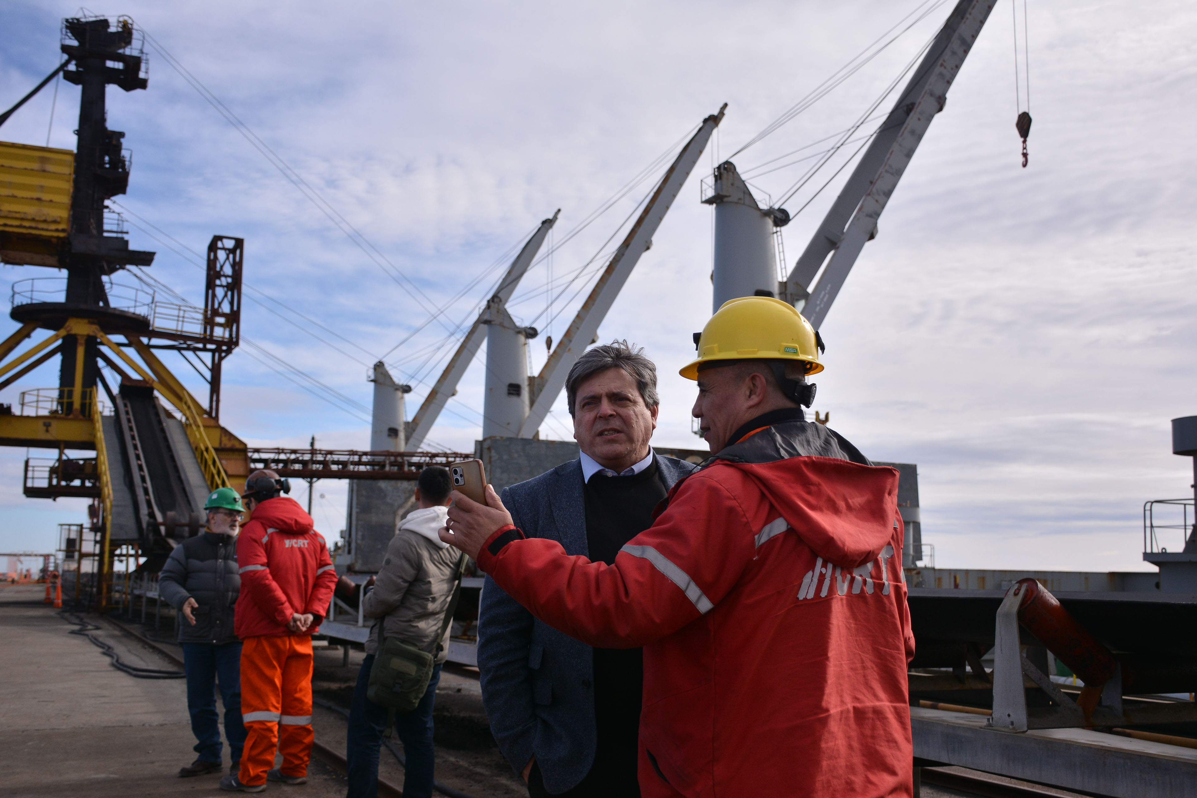 Durante el recorrido por el Puerto de Punta Loyola, el vicegobernador Fabián Leguizamón, fue acompañado por el secretario de Estado de Minería, Pedro Tiberi; y el interventor de YCRT, Pablo Gordillo Arriagada.