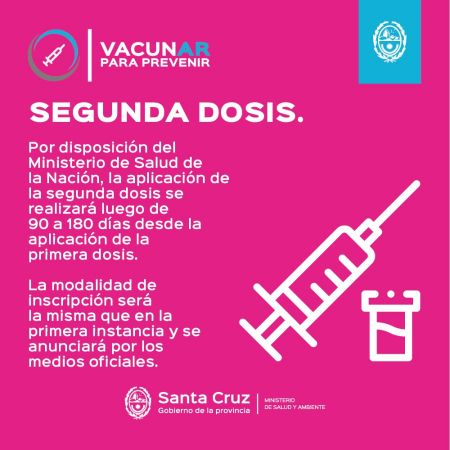 En relación a la aplicación de la segunda dosis, desde el Ministerio de Salud y Ambiente se recuerda que la misma podrá ser aplicada de 90 a 180 días luego de inoculada la primera dosis.