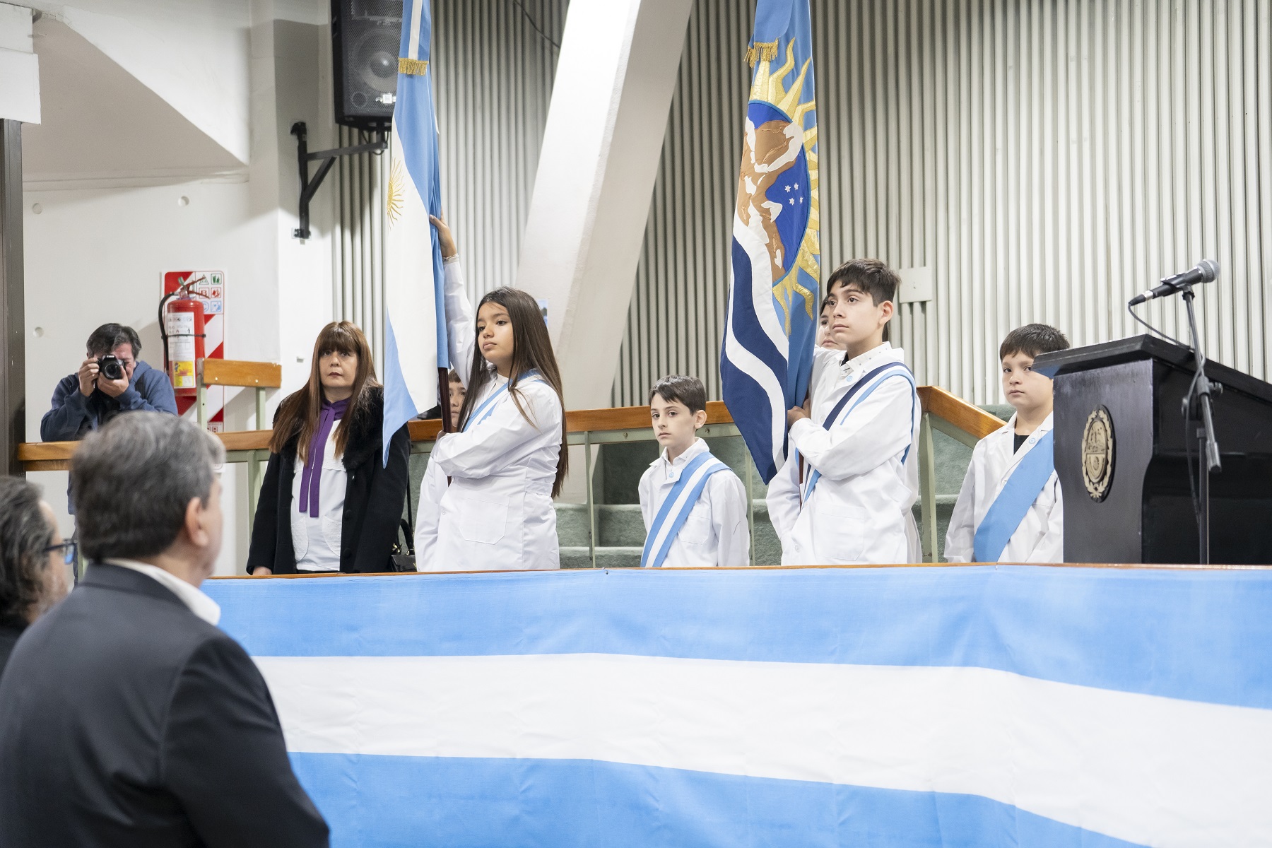 En primer lugar, los presentes recibieron de pie a los alumnos de 7°, 6° y 5° grado de la Escuela Primaria Provincial N° 1 “Hernando de Magallanes”, quienes ingresaron al recinto portando la Bandera Nacional Argentina y la bandera de la provincia de Santa Cruz. Luego entonaron las estrofas de Himno Nacional Argentino, en una versión interpretada por artistas santacruceños.