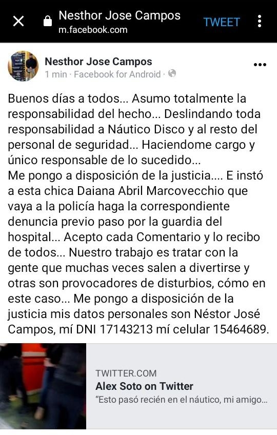 "Asumo totalmente la responsabilidad del hecho, deslindando de toda responsabilidad a Náutico Disco y al resto del personal de seguridad. Me hago cargo y soy el único responsable de lo sucedido", escribió Néstor José Campos en su cuenta de Facebook.