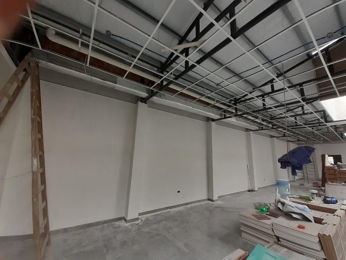 En su avance, en los últimos días se realizó el lijado del enduido de las paredes del SUM principal, comenzando luego con la primera mano de la imprimación, y se terminó de colocar pastina a la totalidad del piso del SUM.